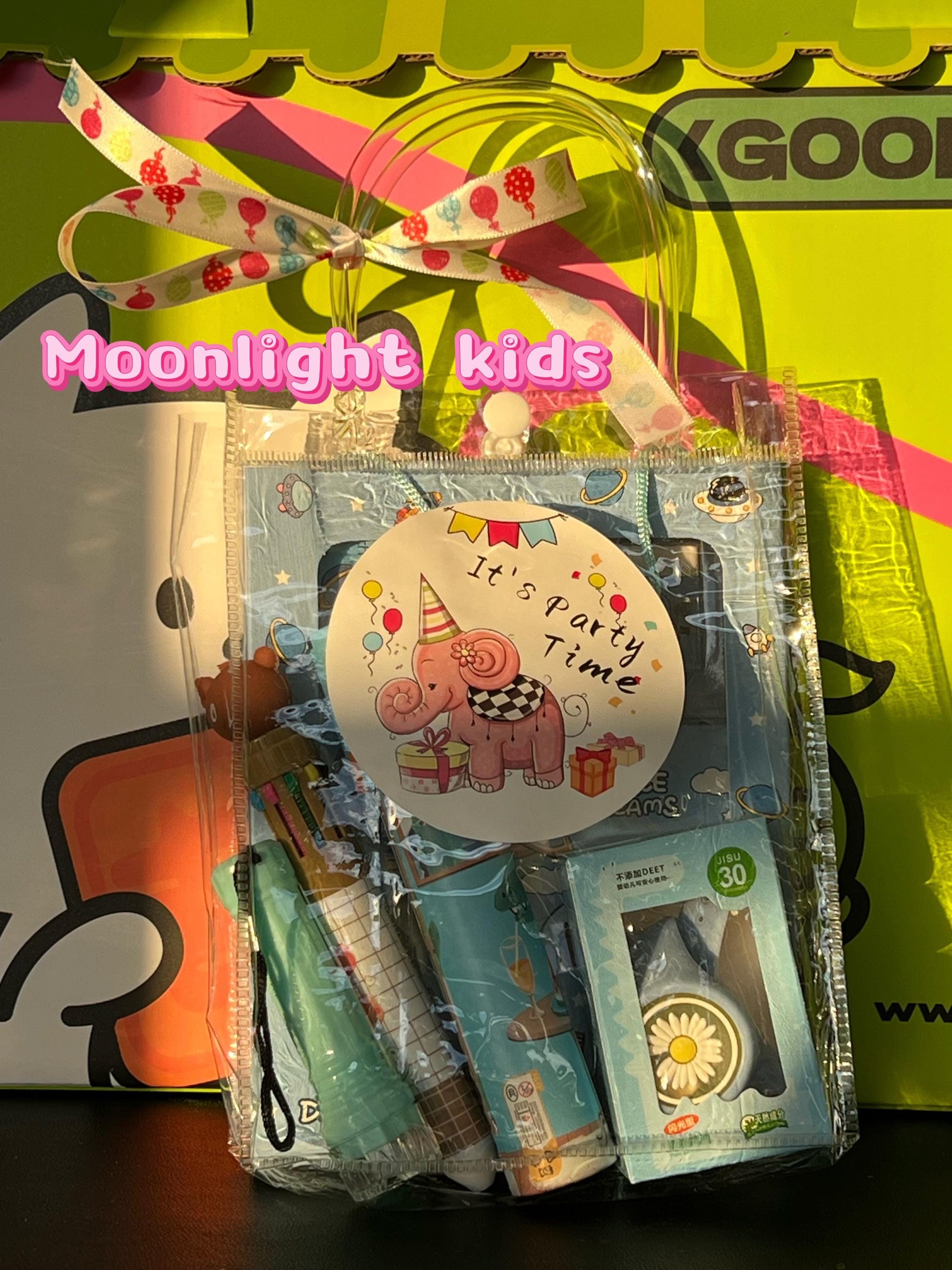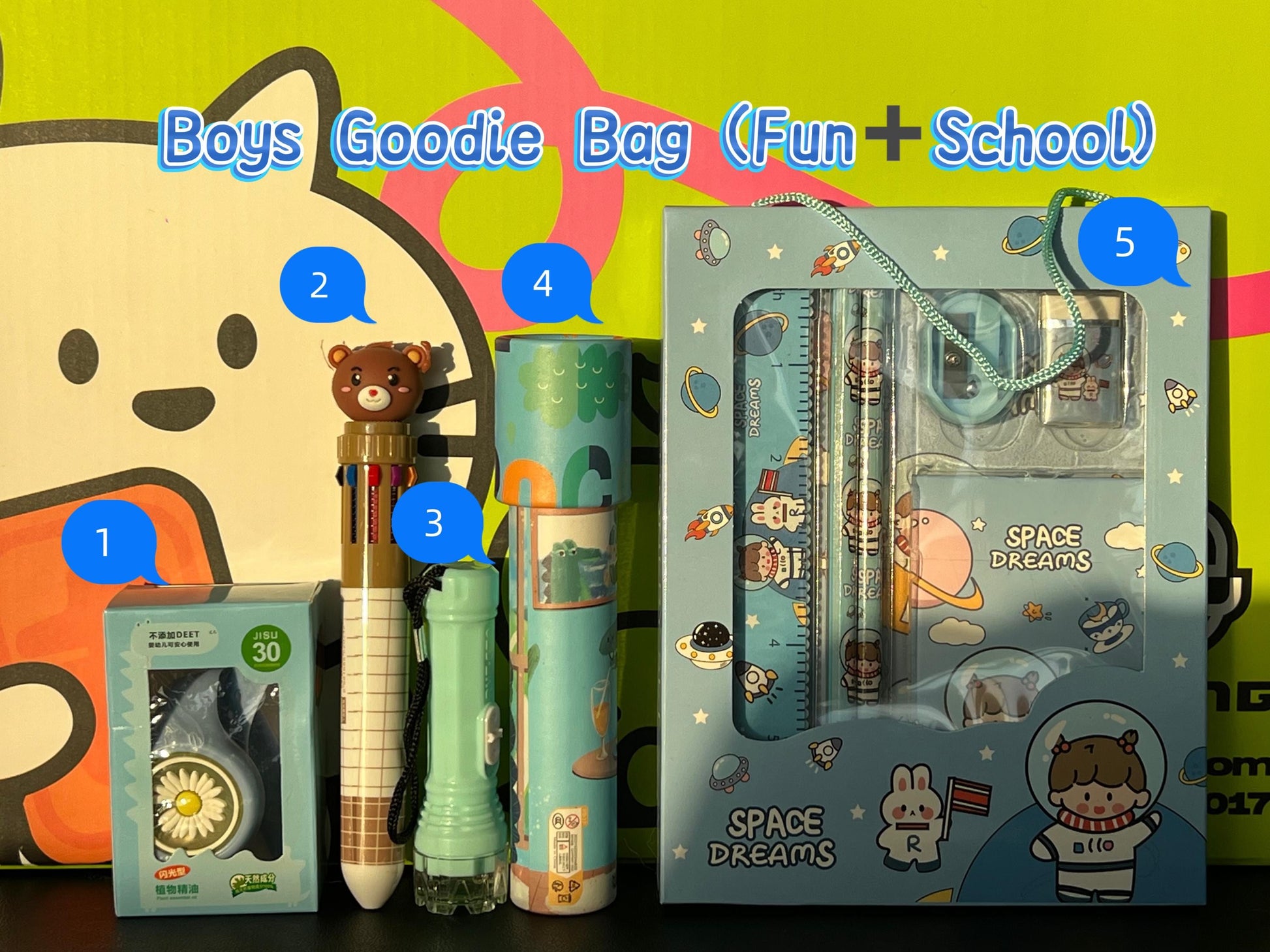 School Set: Includes mosquito repellent wristband, stationery kit, kaleidoscope, flashlight, and multi-color pen.